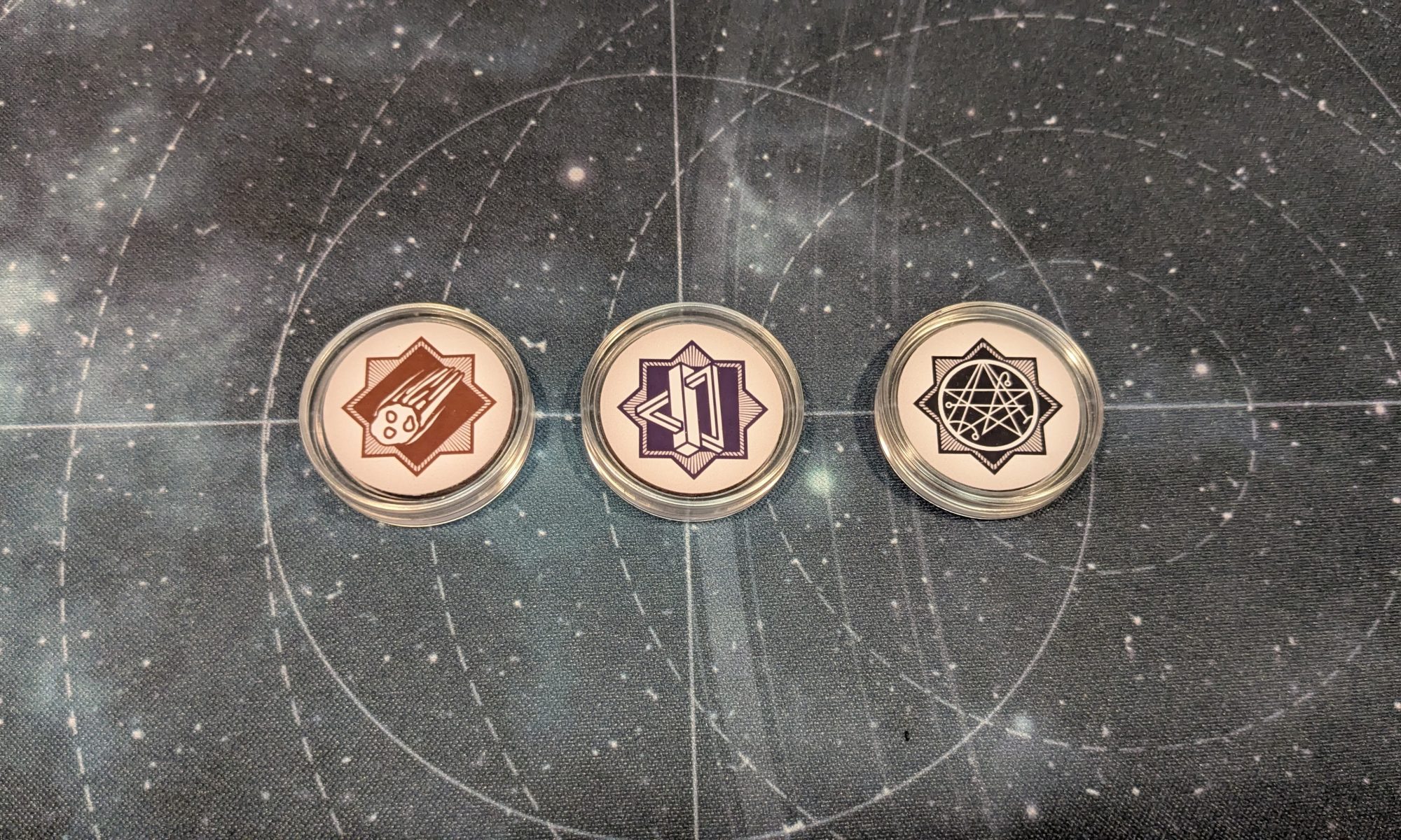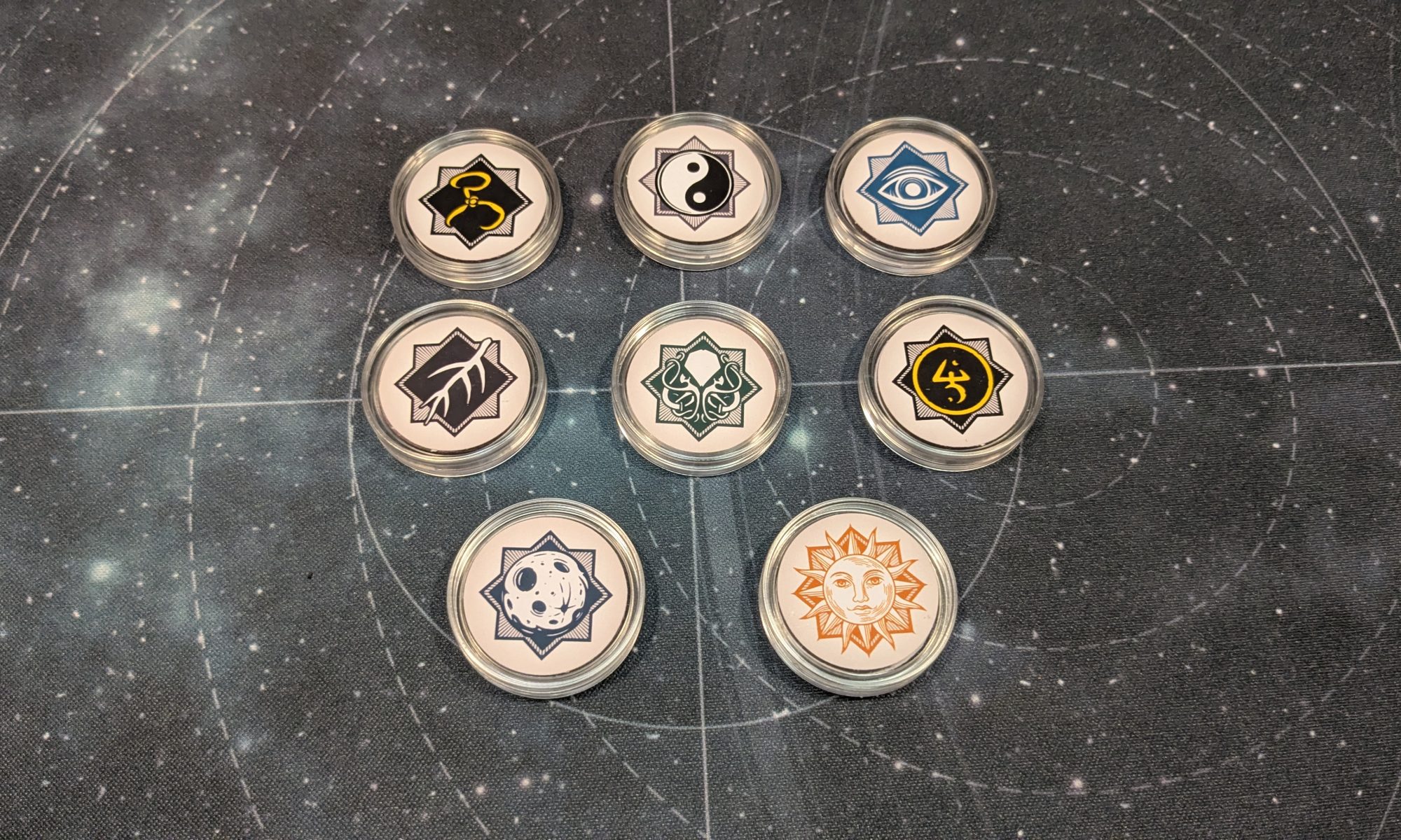 I designed custom chaos tokens for all the factions used in Cosmic Pantheon