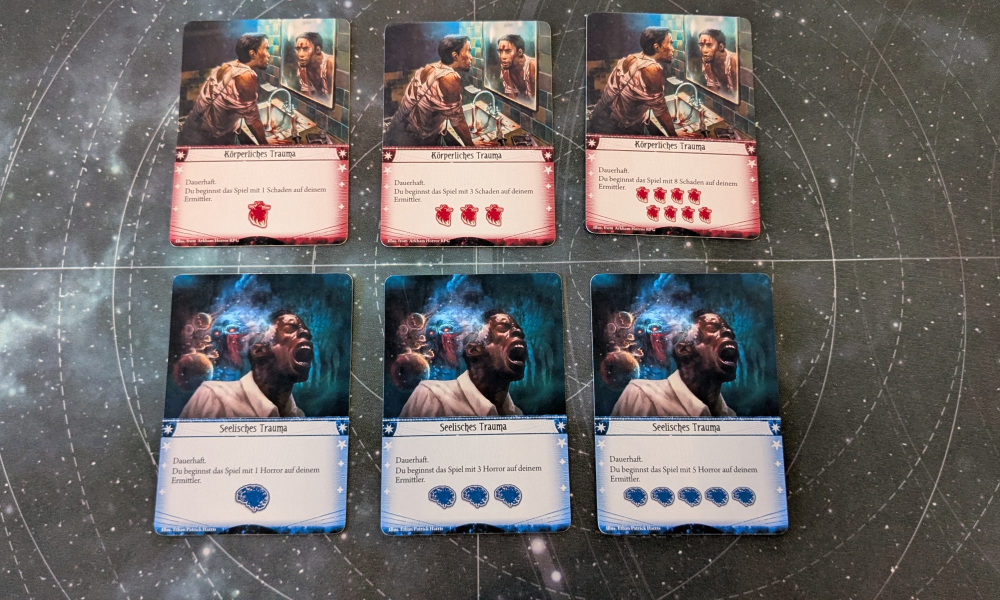 Inspired by some very old cards from an unknown creator I created cards to track both physical and mental trauma.